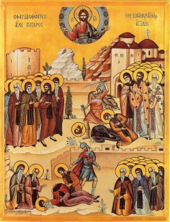 Преподобномученики Пантократорской обители в Дау-Пендели пострадали в день Святой Пасхи 1680 года. В то время монастырь был оплотом православия и греческого самосознания в Аттике, здесь собралась многочисленная и ревностная братия, совершавшая непрерывное — «неусыпаемое» — богослужение.
