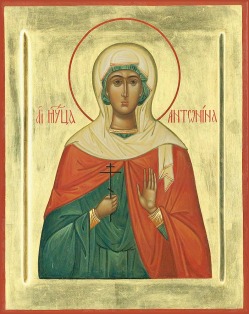 Святая Антонина происходила из города Кродамна (Малая Азия). Как христианку ее привели к правителю Фисту, который уговаривал ее поклониться языческим богам, обещая дать почетное звание жрицы богини Артемиды. Однако святая мужественно исповедала Христа и убеждала правителя отказаться от поклонения бесам. Фист приказал бить святую по лицу и заключить в темницу. Мученница все время пребывала в молитве, не ела и не пила, но однажды услышала голос Божий: "Антонина, подкрепись пищей и будь мужественна, Я с тобой". Когда ее вновь привели к правителю, мученица продолжала твердо стоять за христианскую веру и обличать язычников. Правитель решил отдать святую деву на поругание воинам, но Господь внушил одному из них, святому Александру, спасти мученицу. Он испросил разрешение войти к деве, чтобы склонить ее исполнить волю правителя. Святой Александр предложил мученице надеть его одежду и бежать. Святая Антонина устрашилась, но Господь повелел ей согласиться. Надев плащ воина, она, никем не узнанная, вышла из своего заключения. Посланные Фистом воины нашли святого Александра одного. На вопросы правителя он не ответил ни слова, был предан истязаниям и беспощадно избит. По внушению Господа Иисуса Христа святая Антонина также предстала перед Фистом. Им обоим отсекли руки, затем обмазали смолой и бросили в яму, где пылал огонь. Когда огонь потух, яму засыпали землей, чтобы христиане не могли собрать даже костей мучеников. Вернувшись домой, Фист онемел, не смог пить, ни есть, и после семидневных тяжких мучений умер. Святые мученики Александр и Антонина скончались 3 мая 313 года. В Прологах их память помещается под 10 июня. Мощи святых были перенесены в Константинополь и положены в Максимовом монастыре.