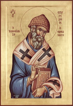 Святитель Спиридон Тримифунтский родился в конце III века на острове Кипр. Он был пастухом, имел жену и детей, все свои средства отдавал на нужды ближних. После смерти жены был избран епископом города Тримифунта. Участвовал в I Вселенском Соборе в 325 году, где защищал христианскую веру от ариенства. Его простая речь и чудотворения, в том числе исцеление больных и изгоняние демонов, привели к обращению многих к Христу.