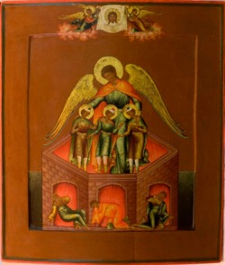 The king Nebuchadnezzar commanded that his image – a huge statue – be erected, to which divine honors were to be paid. For refusing to do this, three youths – Hananiah, Azariah, and Mishael – were thrown into a blazing furnace. The flames rose above the furnace to 49 cubits, scorching the Chaldeans standing nearby, while the holy youths walked in the midst of the flames, offering prayers to the Lord. The Angel of the Lord appeared and cooled the flames, and the youths remained unharmed. The king, seeing this, commanded them to come out and turned to the true God.