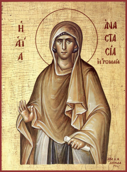 Η Αγία Αναστασία η Ρωμαία ορφάνεψε σε ηλικία τριών ετών και ανατράφηκε σε ένα μοναστήρι κοντά στη Ρώμη, όπου πήρε μοναστικούς όρκους. Στην ηλικία των 21 ετών, κατά τη διάρκεια της βασιλείας του αυτοκράτορα Δέκιου, η Αναστασία, αφού αρνήθηκε ευγενείς μνηστήρες, κατηγορήθηκε από τους ειδωλολάτρες ότι τιμά τον Χριστό. Ο στρατηγός Πρόβος την οδήγησε σε δίκη και διέταξε να προσφέρει θυσία στα είδωλα, αλλά η Αναστασία αρνήθηκε να απαρνηθεί τον Χριστό. Υποβλήθηκε σε σφοδρά βασανιστήρια: της ξήλωσαν τα νύχια, της έκοψαν τα χέρια και τα πόδια και της έσπασαν όλα τα δόντια. Εξαντλημένη, ζήτησε νερό και κάποιος ονόματι Κύριλλος, νιώθοντας συμπόνια, της έδωσε να πιει. Τα βασανιστήρια συνεχίστηκαν και της έκοψαν τη γλώσσα. Τελικά, η Αναστασία αποκεφαλίστηκε και ο Κύριλλος, ως μυστικός χριστιανός, εκτελέστηκε επίσης.