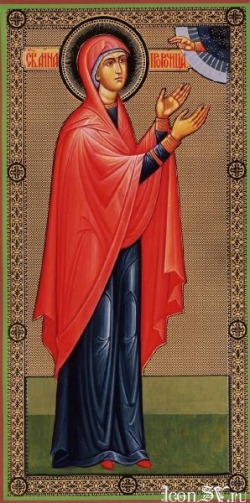 Η αγία και μακαρία Άννα, προφήτισσα, προερχόταν από την πόλη Αρμαέφ και ήταν σύζυγος του Ελκανά, άνδρα από τη φυλή Λευί. Όντας άτεκνη, θλίβονταν πολύ και προσευχόταν στον Θεό, ζητώντας να αποκτήσει παιδιά. Ο Ελκανάς, μοιράζοντας τη θυσία, έδινε στην Άννα μεγαλύτερο μερίδιο, γεγονός που προκαλούσε φθόνο στη δεύτερη γυναίκα του, την Φεννάνα. Λυπημένη, η Άννα στράφηκε στον Θεό με έναν όρκο: αν της έδινε έναν γιο, θα τον αφιέρωνε στην υπηρεσία του Κυρίου. Ο αρχιερέας Ηλί, βλέποντας την προσευχή της, την ευλόγησε, και σύντομα η Άννα γέννησε τον Σαμουήλ, ο οποίος έγινε προφήτης. Μετά την ανατροφή του, τον έφερε στη Σηλώ και τον αφιέρωσε στην υπηρεσία του Θεού. Η Άννα ψάλλει ένα προσευχητικό τραγούδι, εκφράζοντας τη χαρά της για τη σωτηρία. Αργότερα, γέννησε τρεις ακόμη γιους και τρεις θυγατέρες και, σε βαθιά γεράματα, αναχώρησε για τις αιώνιες κατοικίες.