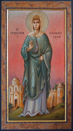 Πριγκίπισσα Ιουλιανία, κόρη του πρίγκιπα Γιούρι Ντουμπρόβιτσκι-Ολσάνσκι, απεβίωσε παρθένα στην ηλικία των 16 ετών. Το σώμα της ετάφη κοντά στην Μεγάλη Εκκλησία της Λαύρας. Στις αρχές του 17ου αιώνα, κατά την εποχή του Αρχιμανδρίτη Ελισαίου Πλετινέτσκι, βρέθηκε το άφθαρτο σώμα της πριγκίπισσας, ξαπλωμένο σε ένα λευκό φόρεμα διακοσμημένο με πολύτιμα κοσμήματα. Ο Μητροπολίτης Πέτρος Μογίλα, λαμβάνοντας όραμα από την αγία, διέταξε την τιμή των λειψάνων της, τα οποία έγιναν πηγή πολλών θαυμάτων και θεραπειών. Η αγία εμφανίστηκε στον ηγούμενο της Μονής Μιχαήλ του Κιέβου, επιπλήττοντάς τον για την αμέλειά του προς τα λείψανά της. Το 1718, τα λείψανα της αγίας υπέστησαν από πυρκαγιά, αλλά τοποθετήθηκαν σε νέο λειψανοθήκη στις Κοντινές Σπηλιές της Λαύρας Κιέβου-Πετσέρσκ. Η Ιουλιανία έγινε η δεύτερη αγία γυναίκα που ετάφη στις σπηλιές της Λαύρας. Είναι η προστάτιδα των Ρωσίδων γυναικών στην θεραπεία των πνευματικών παθήσεων και στέκεται μπροστά στην Υπεραγία Μητέρα και τον Θρόνο της Αγίας Τριάδας.