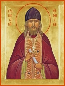 Ο Άγιος Νεκτάριος, ο τελευταίος εκλεγμένος από την σύνοδο γέροντας της Όπτινα, γεννήθηκε το 1853 στην πόλη Ελιτς της επαρχίας Ορλόφ, σε φτωχή οικογένεια. Ορφανός από μικρή ηλικία, εργάστηκε για έναν έμπορο από την ηλικία των 11 ετών. Στα 20 του, με την ευλογία της σχήματος Θεοκτίστης, πήγε στην Μονή Όπτινα, όπου έγινε μαθητής του Γέροντα Αμβροσίου.